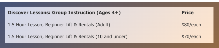 아래는 단체가 와서 레슨을 받아야 할때 인당 비용입니다. 2월에 첫째가 학교에서 5~8학년을 대상으로 써치몬트 스키 필드트립을 가는데 학교는 할인을 좀 더 받았나봐요. 저희는 65달러를 냈는데 홈페이지에 나와 있는 단체 비용이 조금 더 비싸네요.